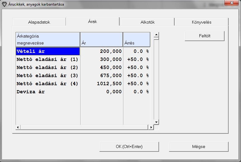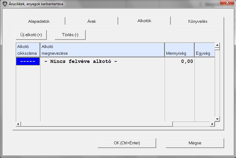 Az ablakban lévő bekérő mezők, megfelelnek az Árucikkek, anyagok karbantartása táblázatban található oszlopoknak.