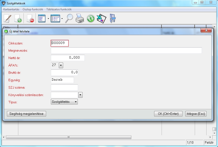 A szolgáltatások szerepelhetnek bizonylat tételként, melyet megadhatunk rögzítéskor vagy felvihetünk előre a szolgáltatás adatbázisba.