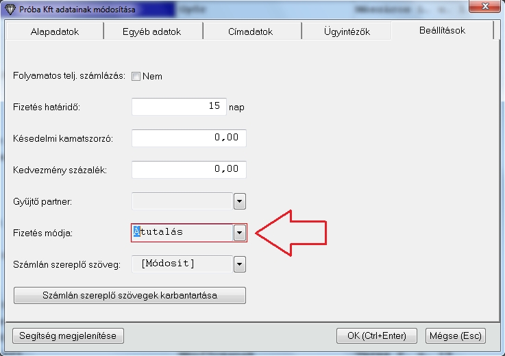 Itt a módosítás gombot lenyomva megkapjuk a szerkesztő ablakot, a beállítás fülön tudjuk beállítani a vevő fizetési módját. Az alábbi képen pirossal bekeretezett mezőn állva az F10 gomblenyomásával tudunk választani.