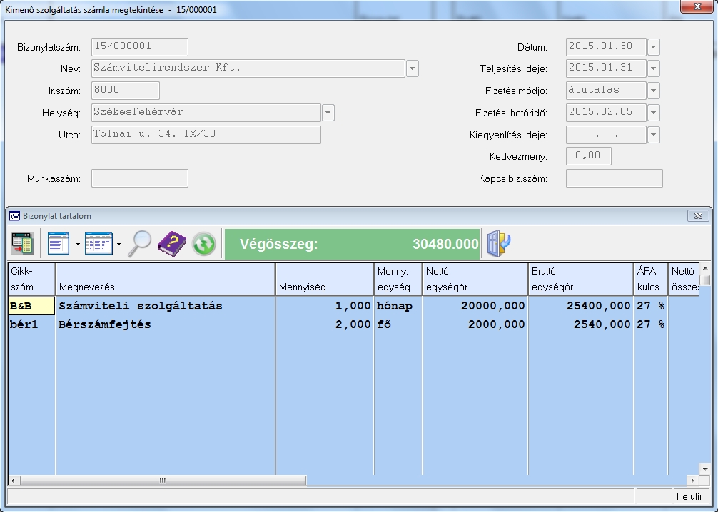 Rögzített bizonylat tartalmának megtekintése.Ha az Bizonylat/Bizonylat műveletek menüpont alatt megkerestük a keresett bizonylatot, akkor annak tartalmát a rögzítés számot, vagy a bizonylatszámon ütött ENTER-rel nézhetjük meg. A partner adatait a partner neve oszlopon nyomott ENTER segítségével nézhetjük meg. Itt a bizonylat tételek tartalma is láthatóvá válik.