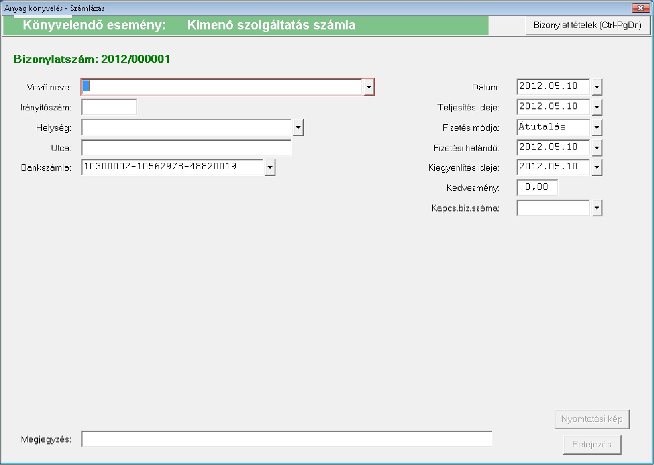 A fejléc mezőinek kitöltése után a dátumokat, fizetési módot is kitölthetjük, ezután a megjegyzést és a bizonylattételeket is felrögzítheti.