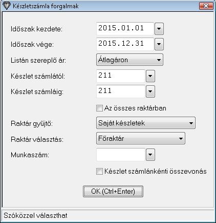 A Listázások / Készlet érték kimutatások / Készletszámla forgalmak menüpontból készlet számlánként csoportosítva egy cikkenként összesített készlet kérhető le programunkból a megadott készlet számla és dátum intervallumra. Lehetőség van továbbá adott raktárra tovább szűkíteni a lista lekérését.