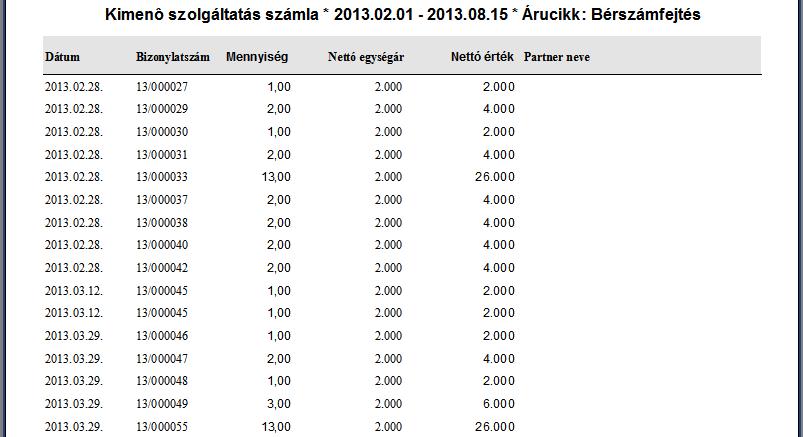 A menüpontra kattintva a program először bekéri az időszakot, majd a bizonylat típusát (milyen számláról akarjuk a listát?). Ezek után kitudjuk választani, hogy árucikk vagy szolgáltatás tételről szeretnénk elkészíteni a listát. A kiválasztás után az adott típus össze választható tétele felugrik egy ablakban, itt kiválasztva kapjuk meg a listát az adott tételre. (Szolgáltatás / bérszámfejtés.)