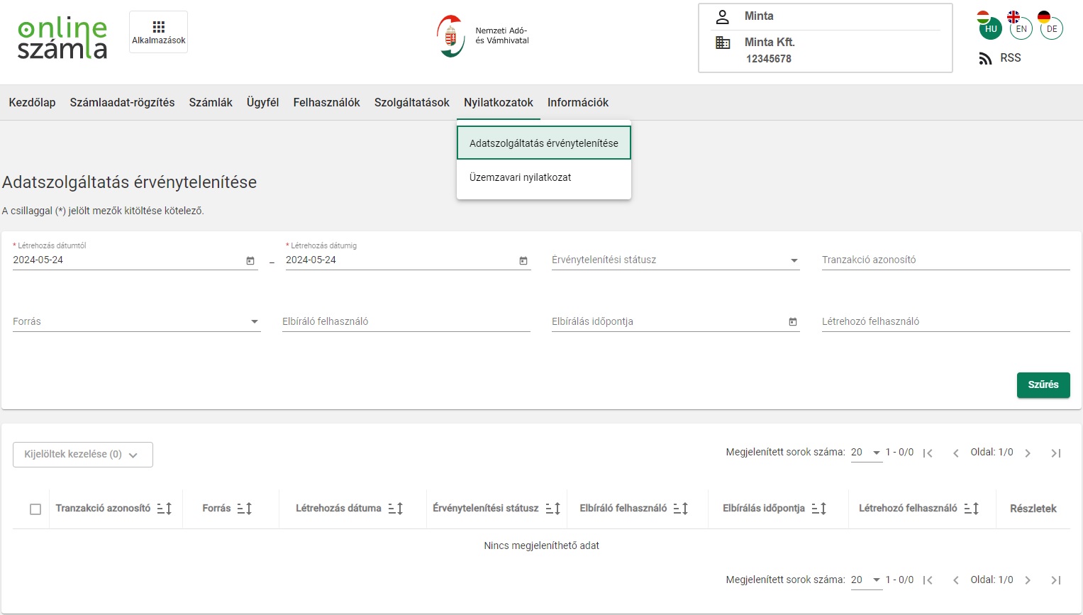 Az online számla felületére szükséges belépni és a "Nyilatkozatok" menüben az "Adatszolgáltatás érvénytelenítése" lehetőségre klikkelve a megjelenő felületen szükséges jóváhagyni az érvénytelenítést.