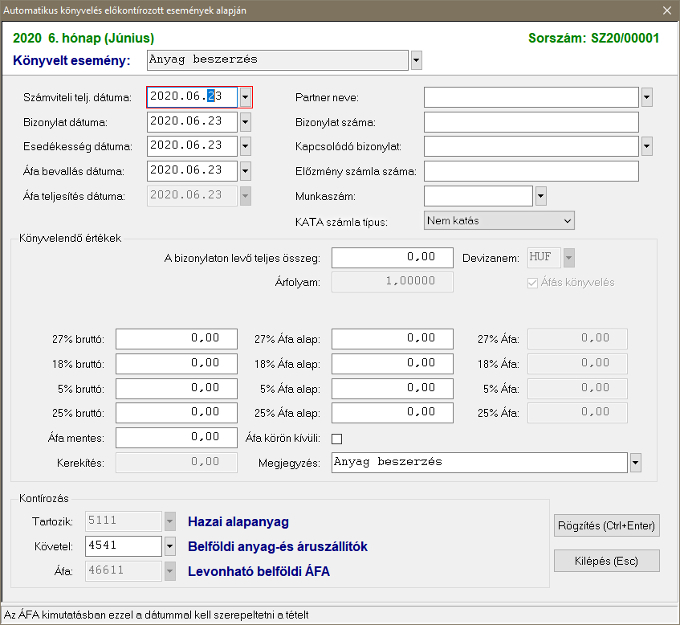 Az összes szükséges adat megadása után a "Rögzítés" gombon enterezve, vagy azon kattintva egy megerősítő kérdést követően rögzíthető a könyvelés. A "Kilépés" vagy az X gombbal egy megerősítő kérdés után a megadott adatok rögzítése nélkül lehet elhagyni az ablakot.