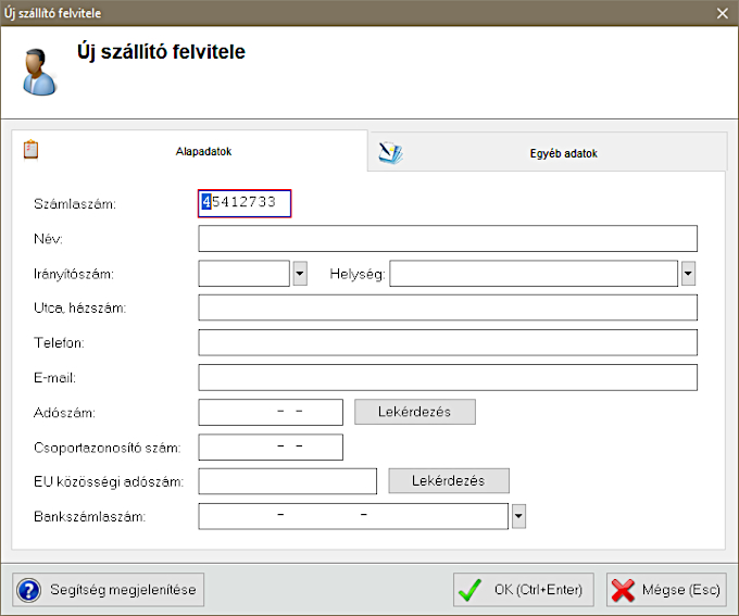Új szállító esetén a következő ablak jelenik meg: