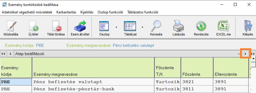 A működéséhez a következő beállításokat kell beparaméterezni. Először indítsuk el a "Karbantartások / Esemény kontírkódok beállítása" menüpontot. Az itt megjelenő ablakban tudjuk beállítani az esemény kódokat.