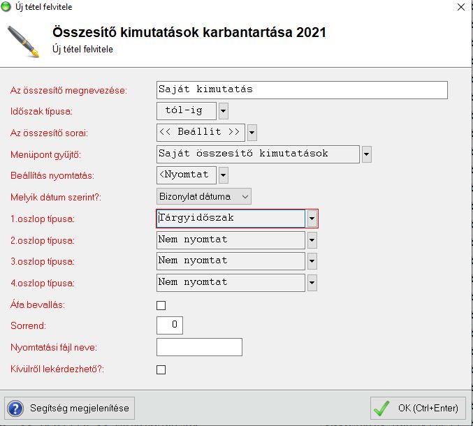 A kimutatások beállítása menüpontban sok egyéb más dolgot is beállíthat, például azt, hogy az adott bevallás Éves/negyedéves/havi legyen-e, a lista nevét, azt, hogy milyen menüpontba gyűjtsön a program, és hogy milyen dátumokat vegyen figyelembe (számviteli teljesítés vagy bizonylat dátuma). Egy beállítási hiba lehet például, ha nem engedi a rendszer nyomtatni a kimutatást, akkor a zárás-nyitás menüben a kimutatások beállításánál az első oszlop típusa valószínűleg nem nyomtatra van állítva. Ilyenkor ezt át kell állítani.
