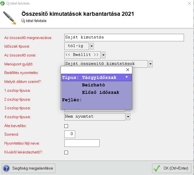 Az 1. oszlop típusát állítsa át Nem nyomtat értékről Tárgyidőszakra. Ezt úgy tudja megtenni, hogy belelép a beállításba és kiválasztja a Tárgyidőszak megnevezést. Ezután egy csillag fog kerülni oda. A választóból az Esc gomb megnyomásával tud kilépni.