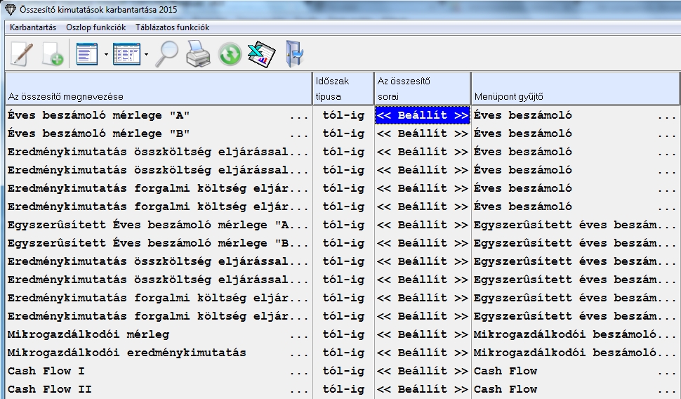 Az éves beszámolók sorai a számlatükörben megadott adatbázis sorokból számolódnak és kerülnek kigyűjtésre. Ezek a sorok alapból be vannak állítva a programban, de lehetőség van ezek módosítására is. Erre akkor lehet szükség, ha például egyedi számlatükröt használ, vagy egyedi kigyűjtésű listát szeretne készíteni. Ugyanitt tudja ellenőrizni az áfa bevallás sorait is. Az adott kimutatás sorai a "Zárás nyitás / Kimutatások beállítása" menüponton belül az "Összesítő sorai" oszlopra enterezve érhető el. Itt látható a kimutatás összes kigyűjtő sora.