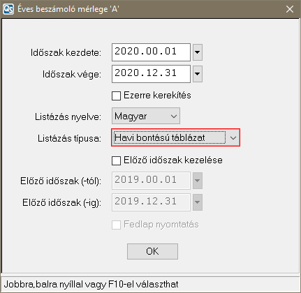 A "Zárás-nyitás" menüponton belül többféle kimutatás lekérhető. Ezek többségénél elérhető a havi bontású táblázat. Viszont a mutatószámoknál, valamint a KATA, KIVA, HIPA és áfa bevallásoknál jelenleg nincs ilyen lehetőség. Az éves beszámoló mérlege 'A' menüponton keresztül mutatjuk be a havi bontású táblázat lekérdezését. A "Listázás típusa" mezőben a "Havi bontású táblázat" elemet kell kiválasztani ehhez a funkcióhoz.