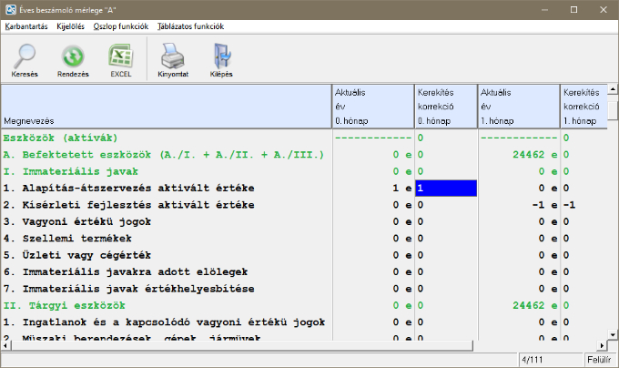 Ebben a táblázatban szükség szerint átírhatók az adatok. Abban az esetben, ha a kimutatás ezres kerekítéssel lett lekérve, a rendszer havonta kerekíti az adatokat, ezért értelemszerűen előfordulhatnak eltérések a havi bontású táblázat értékeinek összege, és a többi lekérési lehetőség értékei között. Azonban havi bontású lekérdezési módban is van lehetőség az adatok kerekítési korrekciójára a hónap oszlopok után megjelenő "Kerekítési korrekció X. hónap" oszlopokban. Itt az Enter billentyűvel vagy dupla kattintással módosítható a kerekítés 1, -1, 0 értékkel.