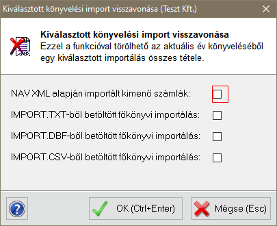 A "Karbantartás / Adatmentés, visszatöltés / Kiválasztott könyvelési import visszavonása" menüpont segítségével vissza lehet vonni többfajta főkönyvi importálást, vagyis ki lehet törölni egy-egy importálás összes könyvelési tételét.