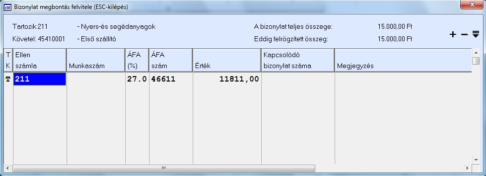 A hibásan rögzített sor a - gomb segítségével törölhető a táblázatból. Amennyiben végeztük az ellenoldali tétel(ek) felvitelével akkor ez ESC gomb segítségével, vagy egérrel az ablakzáró X gombra kattintva rögzíthetjük az ellenoldal tételeit. Ha a felső táblázatban megadtuk a bizonylat teljes összegét, akkor addig nem engedi rögzíteni a megbontott tételeket a rendszer amíg a felrögzített összeg eltér a teljes összegtől. Ha minden rendben van akkor a tétel rögzítésre kerül a felviteli állományba és visszakerülünk a felső táblázatba. Ezután a felső táblázatban a + gomb segítségével új szállítói tétel rögzítését kezdhetjük meg. A felső táblázatban a - gomb segítségével a teljes aktuális szállítói tétel törlése lehetséges. Az F2 gomb segítségével könyvelés közben is kezdeményezhető az eseménykönyvelés funkció használata. (Ennek részletes leírását itt találhatja) Az F12 billentyű, a Shift+F12 valamint a Ctrl+F12 billentyűkombinációk segítségével az előzőleg felvitt tétel különféle módokon megismételhető. Ezekről a funkciókról bővebben a Könyvelési tételek másolása (sorduplázás) című cikkben lehet olvasni.