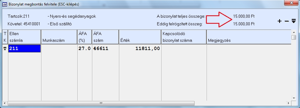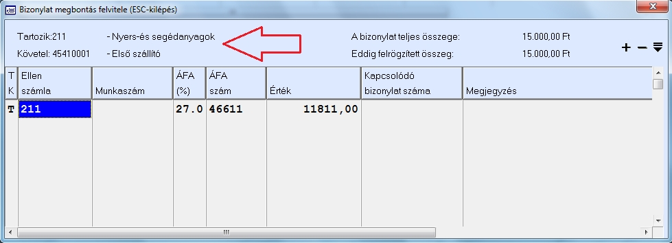 A könyvelési ablak fejrészben tudjuk legelőször megadni azt, hogy a szállító számlának a tartozik vagy követel oldalára szeretnénk az első tételt rögzíteni, majd ezután beírhatjuk vagy kiválaszthatjuk az F10 gomb segítségével a szállító folyószámláját, majd megadhatjuk a bizonylatszámot, a könyvelt hónapon belüli napot és a teljesítés dátumát, valamint az esedékesség dátumát. A bruttó érték mezőbe írjuk be a szállító számla vagy tétel teljes értékét és ekkor automatikusan átkerülünk az alsó táblázatba ahol a bizonylat megbontását vihetjük fel. A bruttó érték mezőt üresen is hagyhatjuk, és akkor később kitöltődik. Ebben az esetben a jobb felső sarokban található "Ellenoldal" nevű gombra kattintva is megkezdhető a bizonylat megbontásának felvitele.