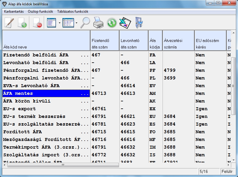 Az ÁFA kódok karbantartás menüpontban az áfa kódok nevei mellett megtalálhatja a hozzájuk rendelt Fizetendő és Levonandó ÁFA számokat.