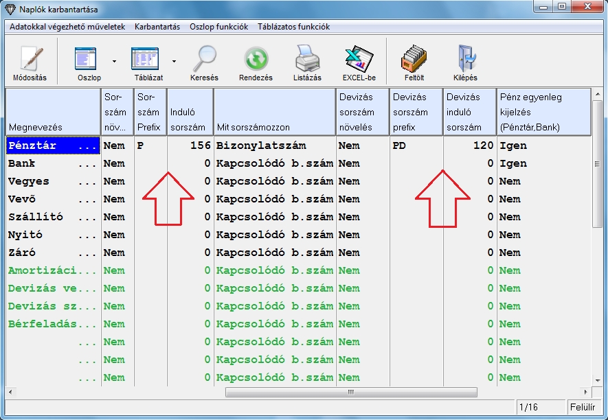 A "Devizás sorszám növelés" oszlop bekapcsolása esetén a devizás könyveléskor a "Devizás sorszám prefix" oszlopban megadott prefix-szel a "Devizás induló sorszám" mezőnek megfelelő következő sorszámmal történik a naplósorszámozás.