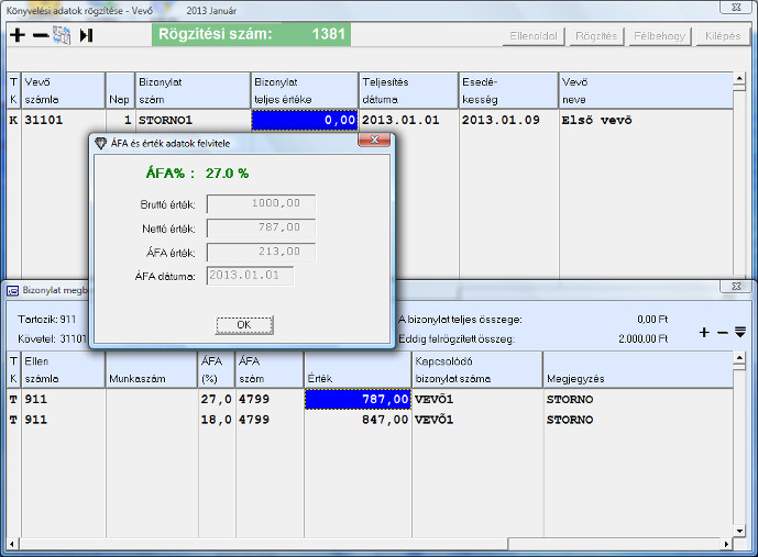 Egy számla sztornóját az eredeti bizonylat T/K oldalainak felcserélésével kell könyvelni. Ennek automatikus kezelésére csak a vevő és a szállító naplókban van lehetőség.
