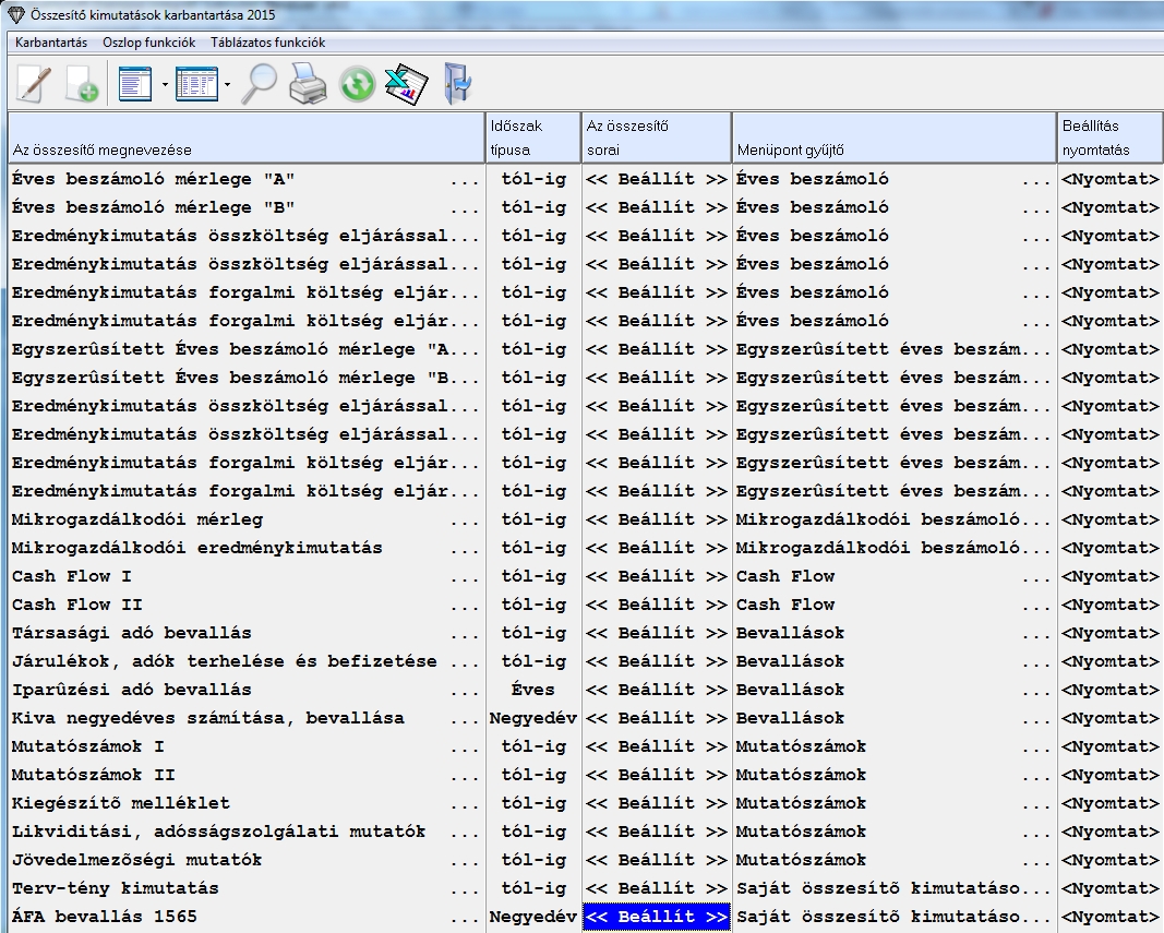 A paraméterezést a Zárás-nyitás / Kimutatások beállítása menüpontban teheti meg. Itt az ÁFA bevallás "Az összesítő sora" oszlopon a "<< Beállít >>" mezőre enterezve éri el a sorokat.