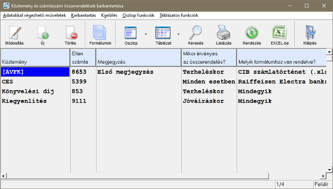 Ebbe a törzsbe tetszőlegesen felvehet és törölhet sorokat, de bekapcsolható a banki importálás során egy öntanuló mechanizmus is, ami szintén rögzíthet ide új sorokat. Erről bővebben itt olvashat: Banki import állomány beolvasása