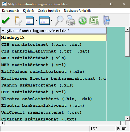 Ha az importálás megkezdése előtt (vagyis amikor még üres a könyvelési képernyő) indítjuk el ezt a táblázatot, akkor az összes elérhető formátumhoz látjuk a közlemény hozzárendeléseket. Ilyenkor lehetőség van egyik formátumról áttérni egy másikra az enter billentyű használatával (egy felugró ablakból lehet kiválasztani a kívánt új formátumot).
