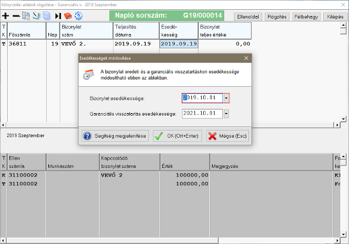 A "Könyvelés->Tetszőleges naplóra könyvelés" menüpontban kiválasztható a beállított garanciális visszatartás napló. Ebben a naplóban egy fej alatt két esedékességi dátumot is meg kell adni, ezért az "Esedékesség" oszlopon enterezve egy kis dialógusablak jelenik meg. A "Bizonylat esedékessége" mezőbe az előírás esedékességét kell megadni, míg a "Garanciális visszatartás esedékessége" mezőbe az éppen könyvelt garanciális visszatartás esedékességét.