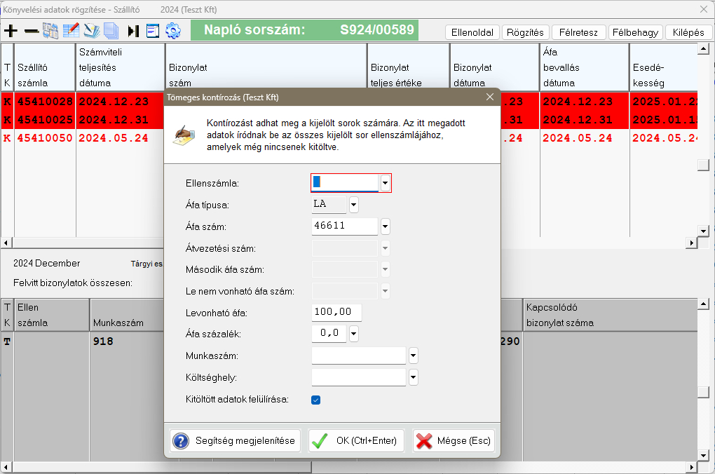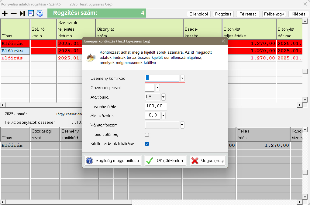Az ablakban az OK gomb megnyomását követően a rendszer berögzíti a megadott adatokat a kijelölt sorokba. Ha az áfa százalékhoz nullától eltérő adat lett megadva, akkor a rendszer újra számítja a tételek értékeit is. Ehhez egyenes áfa esetében a bruttóból, fordított áfás beszerzés esetén a nettóból indul ki.