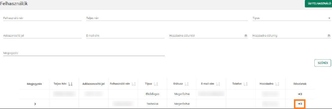 Az online számla felületére belépve a "Felhasználók" lehetőségre klikkelve megjelenő oldalon szükséges legörgetni és az érintett technikai felhasználó sorában a "Részletek" oszlopban a képen kijelölt gombra klikkelni.