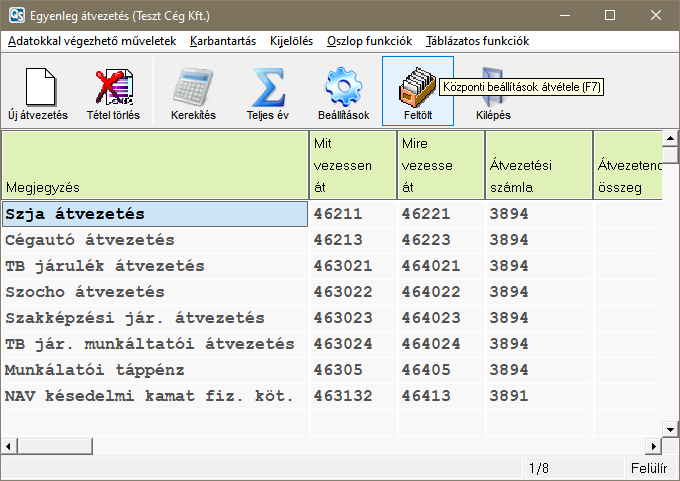 Központilag felvenni a Bérjárulék átvezetést melyet egy gombnyomással átemelhetünk, ehhez a "Feltölt" gombra kell kattintani.