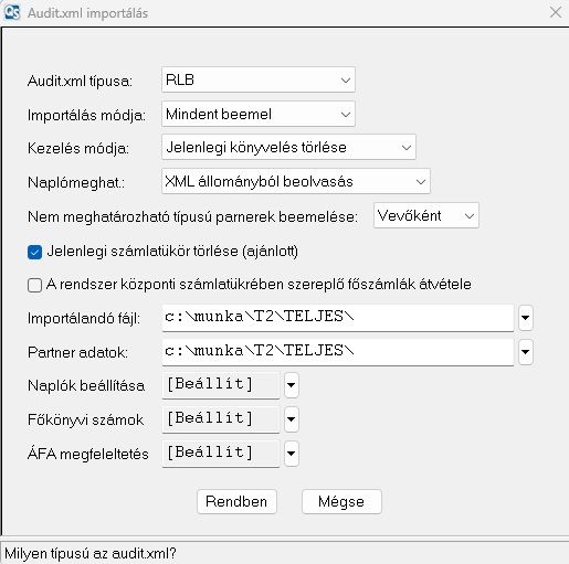 Az Audit.xml típusa mezőben kiválasztható, hogy melyik programban előállított állományt szeretne beemelni. Kiválasztható továbbá, hogy milyen adatokat szeretnének beemelni: Mindent amit az állomány tartalmaz, Csak a számlatükröt, Csak a partnereket, Számlatükröt és Partnereket, Partnereket és könyvelést. Az első és ötödik lehetőségen kívül egyik lehetőségnél sem fog a könyvelés importálódni.