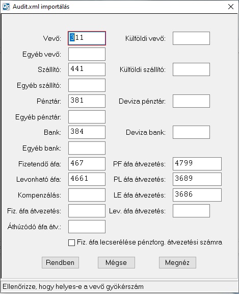 FONTOS: Az AUDIT.XML fájl felépítése miatt program nem képes helyesen importálni minden speciális könyvelési tételt. Ilyenek lehetnek a részben levonható és le nem vonható tételek, valamint a fordított áfák, mint például a mezőgazdasági, építőipari, az EU-s termék beszerzés vagy a termék import ÁFA.
