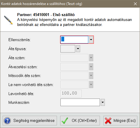 Rendszerünk Professional könyvelő moduljával lehetőség van hozzárendelni a szállítókhoz egy ellenszámlát és áfa adatokat, amelyeket a program automatikusan felajánl a könyvelési képernyő ellenoldalán.
