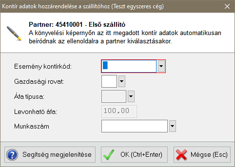 A szállítókhoz is hozzárendelhetők kontírozási adatok. Erről a következő cikkben található bővebb információ: Kontírozás hozzárendelése vevőhöz