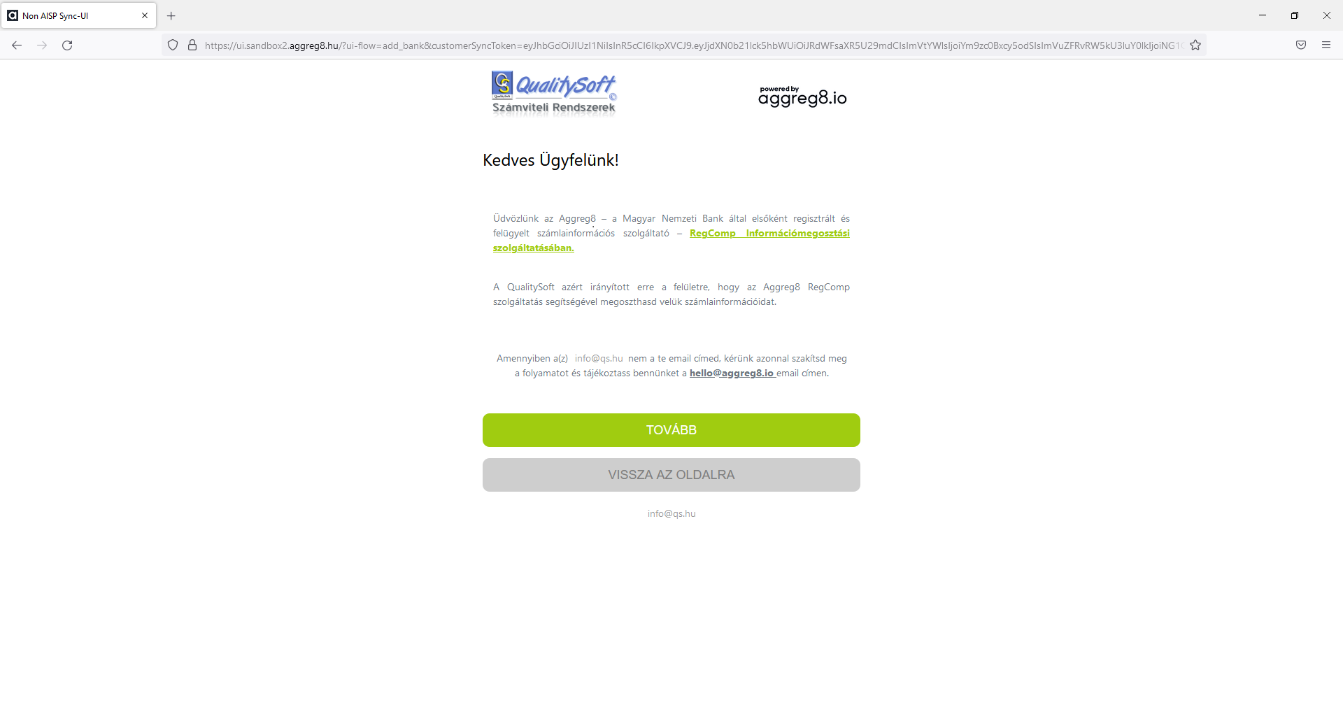 A szinkronizálás indításához szükség van egy e-mail címre és használni kívánt adatok engedélyezésére az aggreg8 rendszerében. Mindig csak azokat a bankszámlákat tudjuk használni amik az adott cégben lettek felvéve.