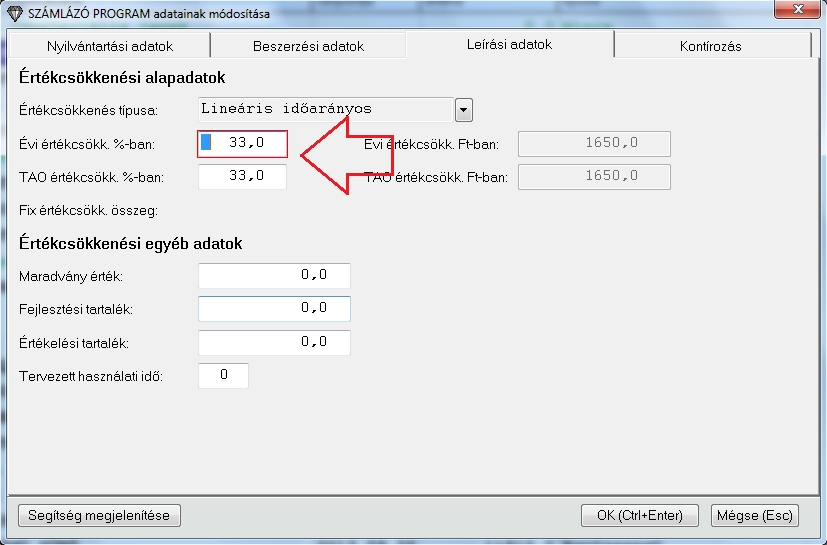 Itt a módosítani kívánt eszközön állva a "SPACE" gomb lenyomásával megjelenik az adott eszköz módosítás ablaka. Itt az évi érték csökkenés mezőn vagy a társasági adó ÉCS. mezőn állva "ENTER"-t nyomva tudják módosítani a leírási kulcsot.