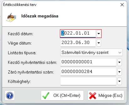 A kezdő dátum alapból a legutolsó elszámolt értékcsökkenésre következő hónap, a vége dátum pedig a 18 hónappal későbbi időpont. A számítási intervallum megváltoztatható, ez befolyásolja a futási időt. Minél nagyobb időszakra kérjük le, a számolás annál több időt fog igénybe venni. Amennyiben sok eszközre, több hónapnyi időt akarunk számolni, egy üzenetben kaphatunk egy értesítést arról, hogy a folyamat több percet is igénybe vehet.